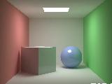 Here the right box is translucent. Note how the light bleeds from the light source bleeds down through the box. Also note how the box still captures the indirect illumination in the scene as well as acts as a secondary source for the other elements such as the ceiling and the wall. This image was rendered for the paper "A Rapid Hierarchical Rendering Technique for Translucent Materials". |